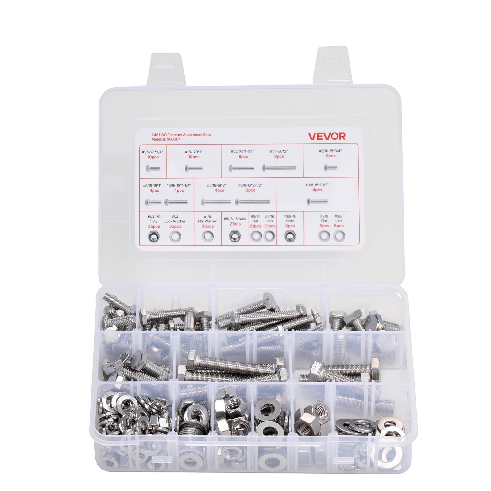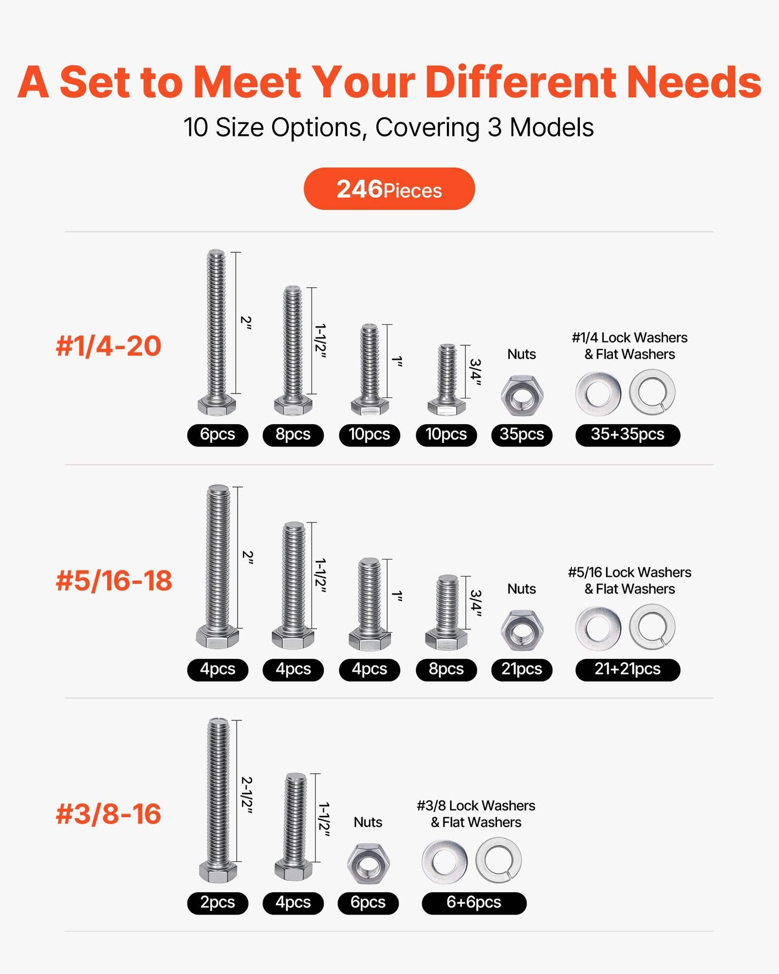 246-Piece Multi-Specification Set: This practical bolts, nuts, and washers set includes 246 pieces of imperial bolts, nuts, and washers, covering #1/4-20, #5/16-18, #3/8-16 (including flat washers and spring washers in #1/4, #5/16, #3/8 sizes) in various lengths. Ideal for general repairs and replacements