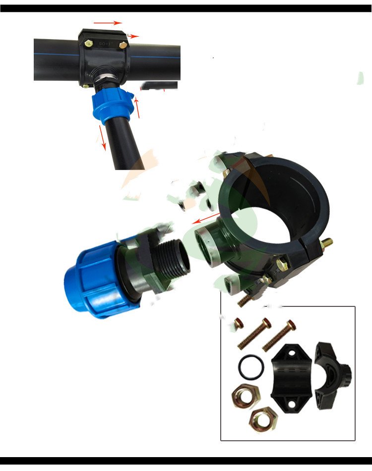 The PE main pipe is installed on the saddle, the quick connect outer wire is directly screwed to the saddle, and the PE branch pipe is connected to the other end.